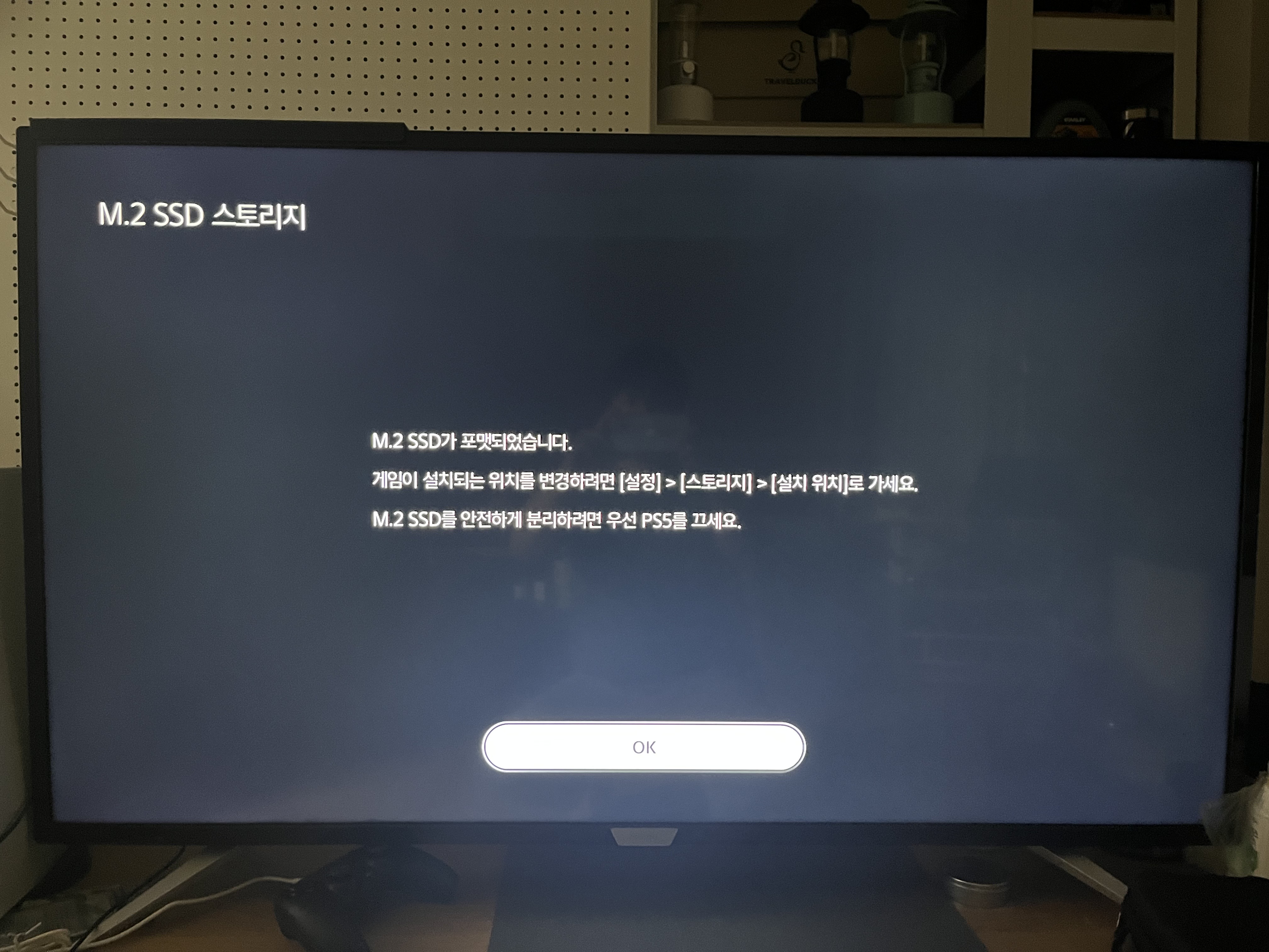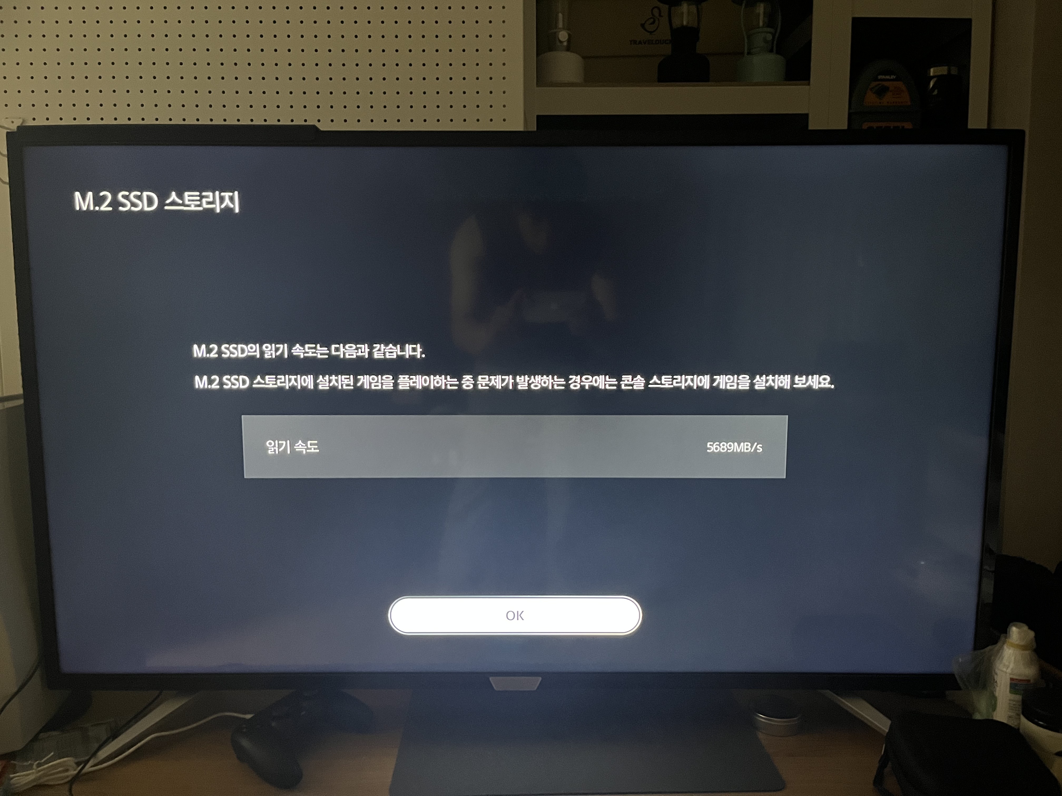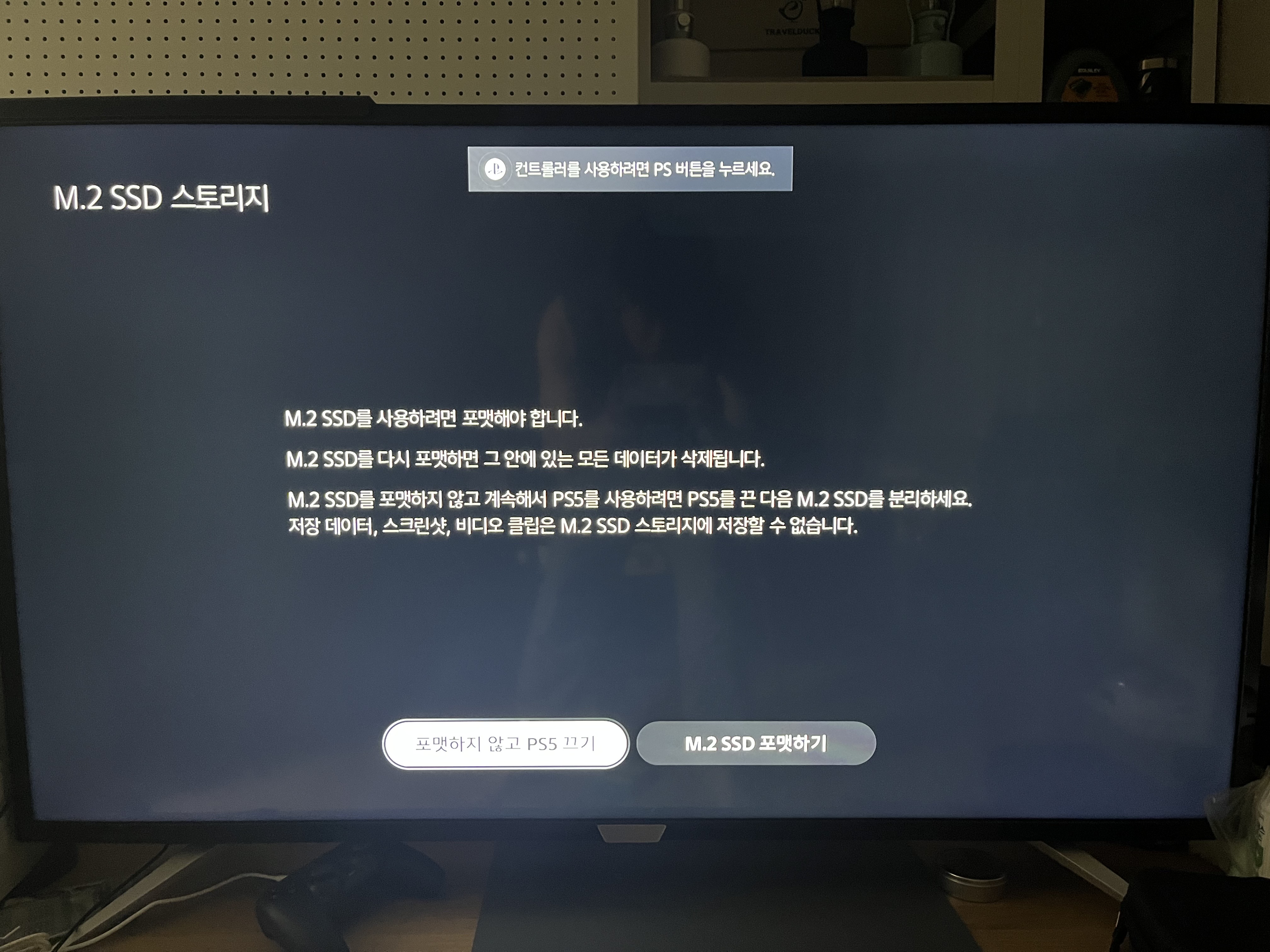 5단계 : 커버들을 제거했던 역순으로 결합 후 플스5의 전원을 눌러주면 아래 사진과 같이 인식을 하게 되면 장착한 SSD의 읽기 속도를 확인해주고 최초 부팅시 장착한 SSD를 포맷을 해야 합니다.